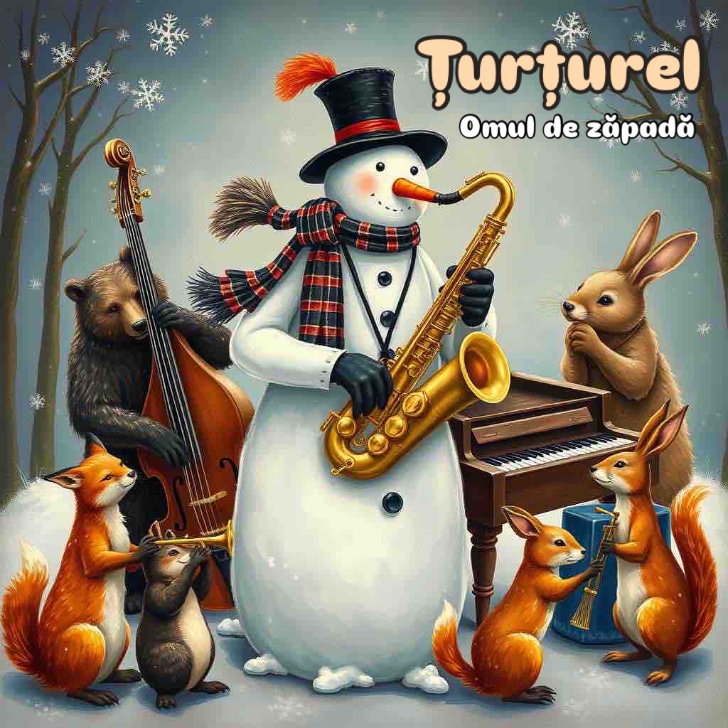 Țurțurel, omul de zăpadă, cânta la saxofon cu prietenii lui, animalele din pădure. Dar după un timp aceștia se opresc, înghețați de frig, în țurțuri și îi spun: